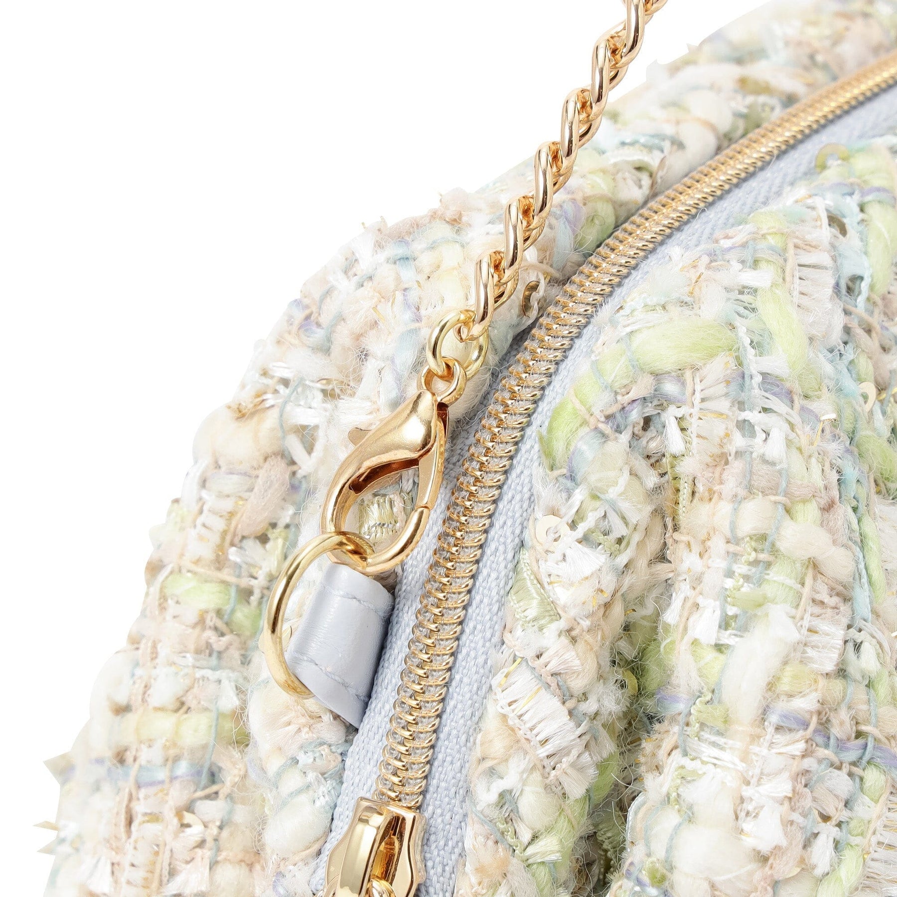 This pouch features a classic Francfranc design, combining pastel-colored tweed and fur.