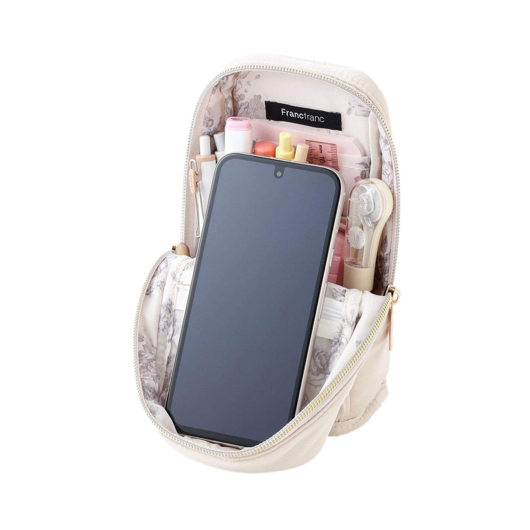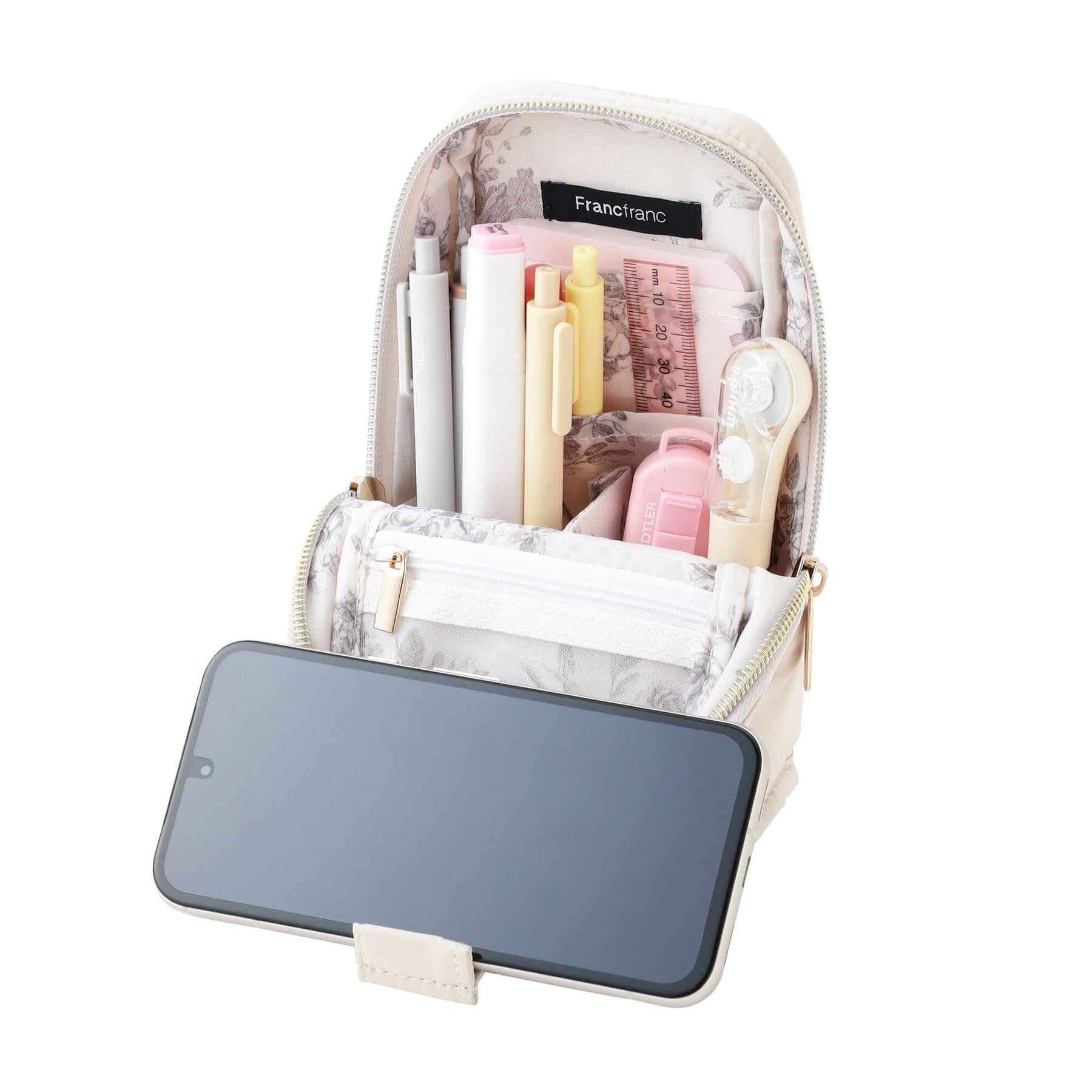 This convenient pouch neatly stores pens and doubles as a smartphone stand.Store stationery and makeup in it, then open the lid to use it as a stand.