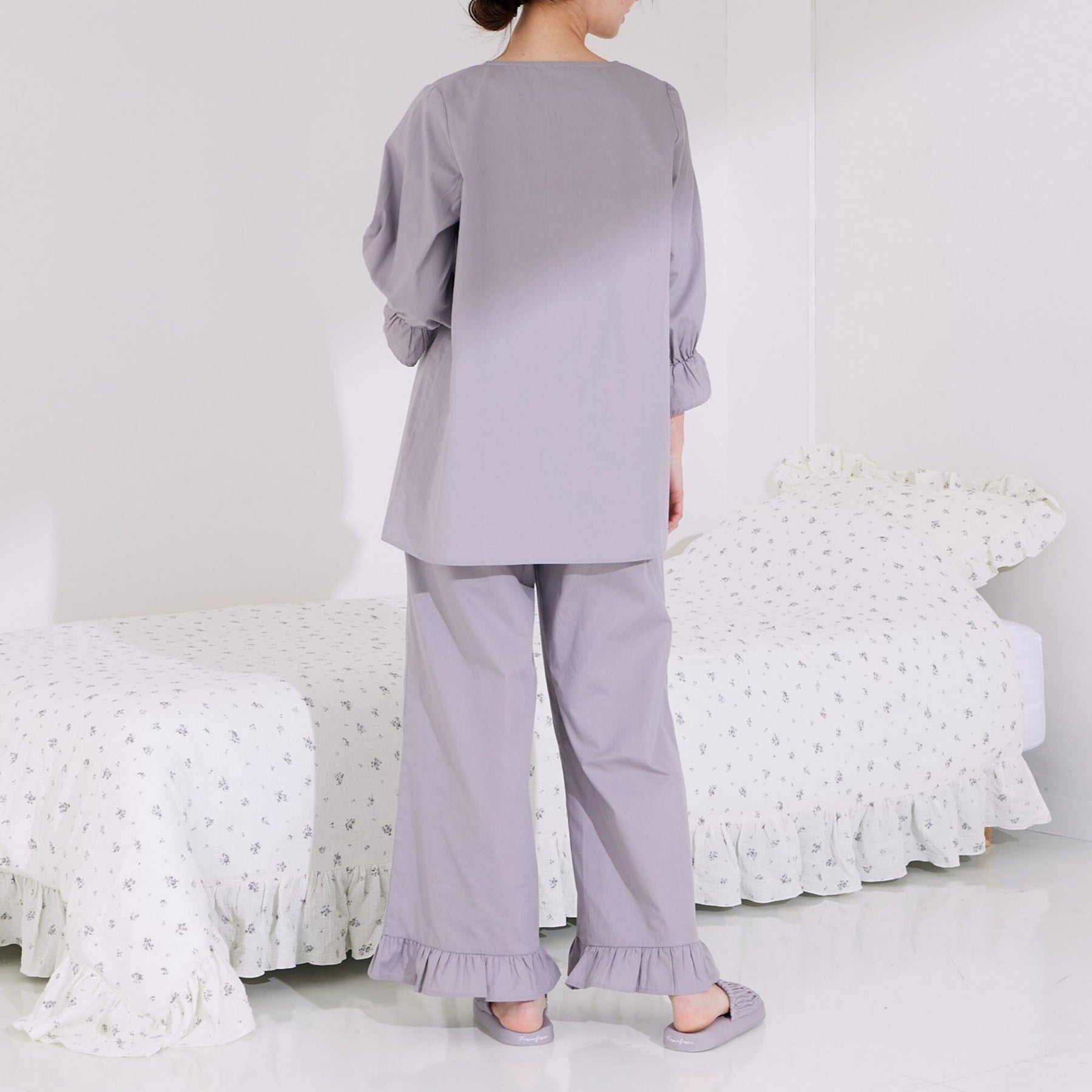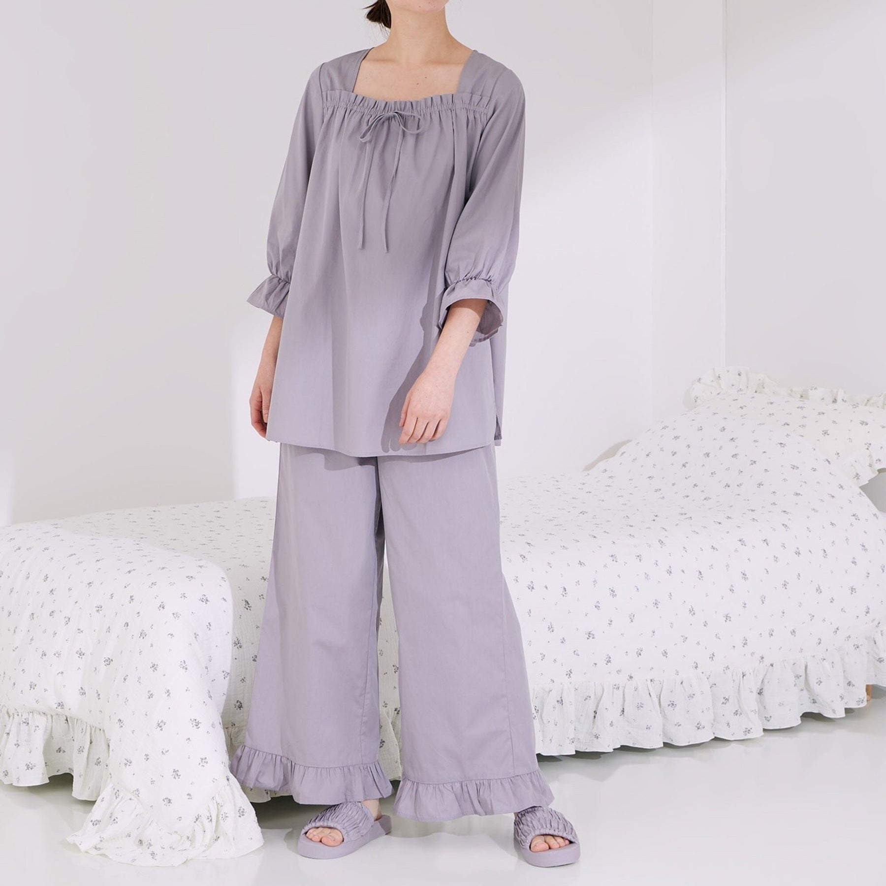 These pajamas are made from soft cotton material that has been processed to be flexible, making them smooth and comfortable against the skin.The fabric has a high moisture retention rate, making it recommended for those with dry skin.