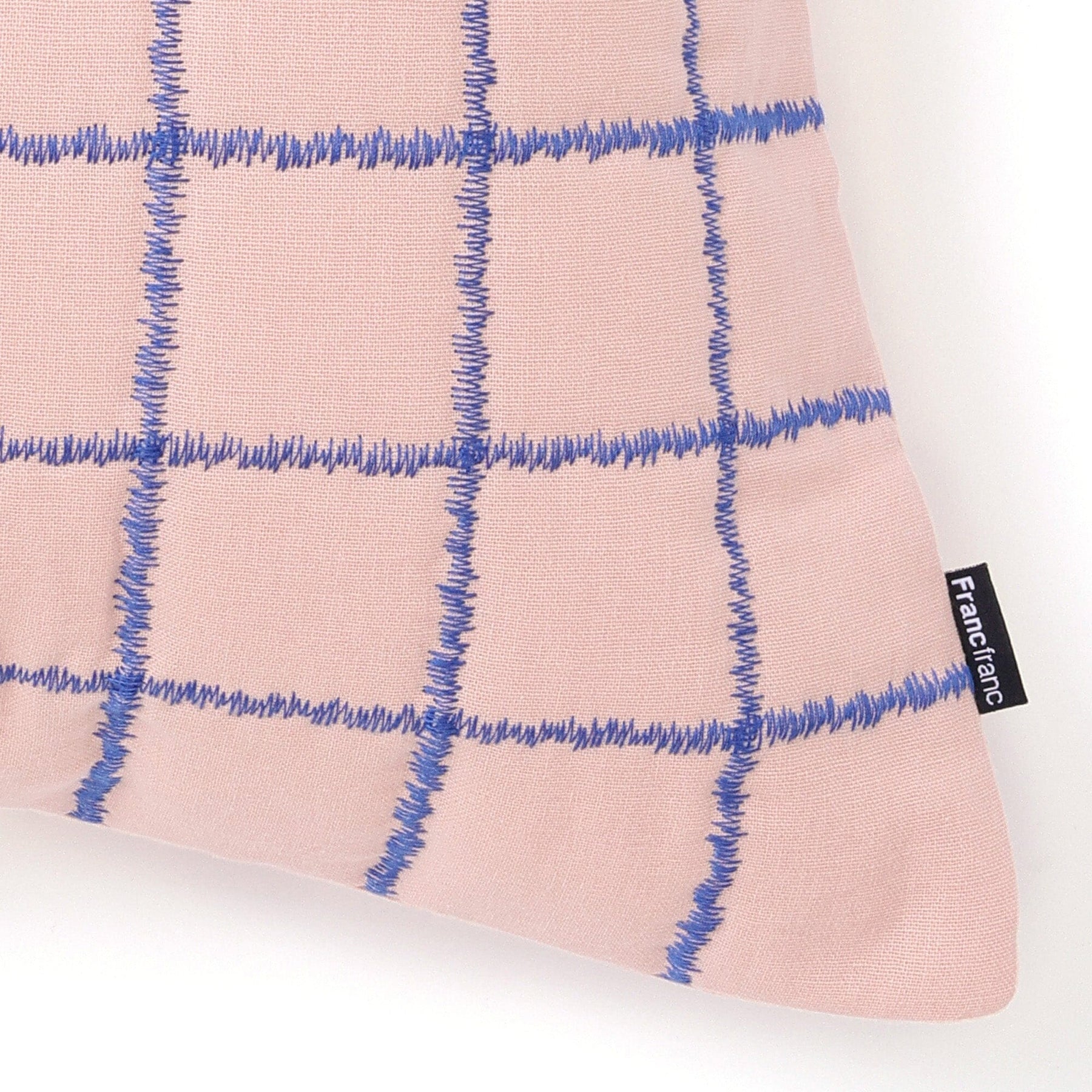 This cushion cover features a windowpane pattern on velvet fabric with zigzag stitching.