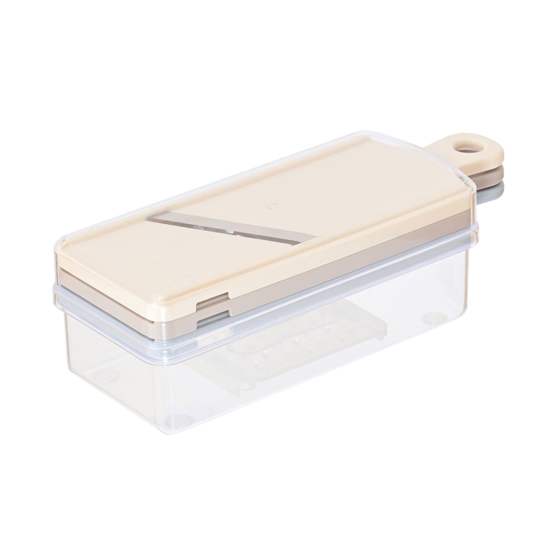 Size: Package Size: W89×D233×H74mm Product Size: W85×D230×H73mmMaterial: Plate: ABS resin, Safety Holder: Polypropylene, Container & Lid: Styrofoam resin, Non-slip: Silicone rubber, Metal Parts (Blade): Stainless steel