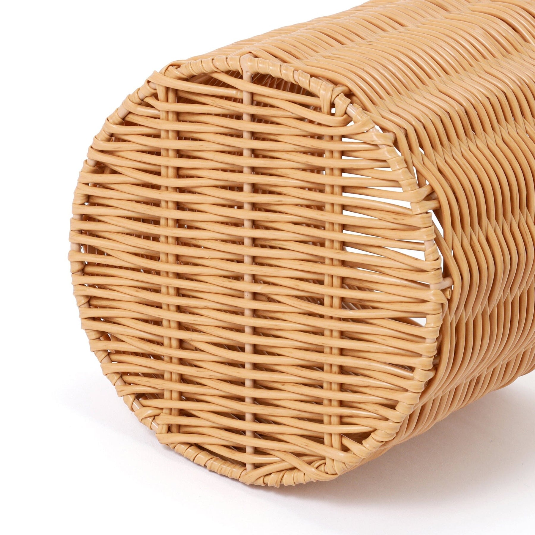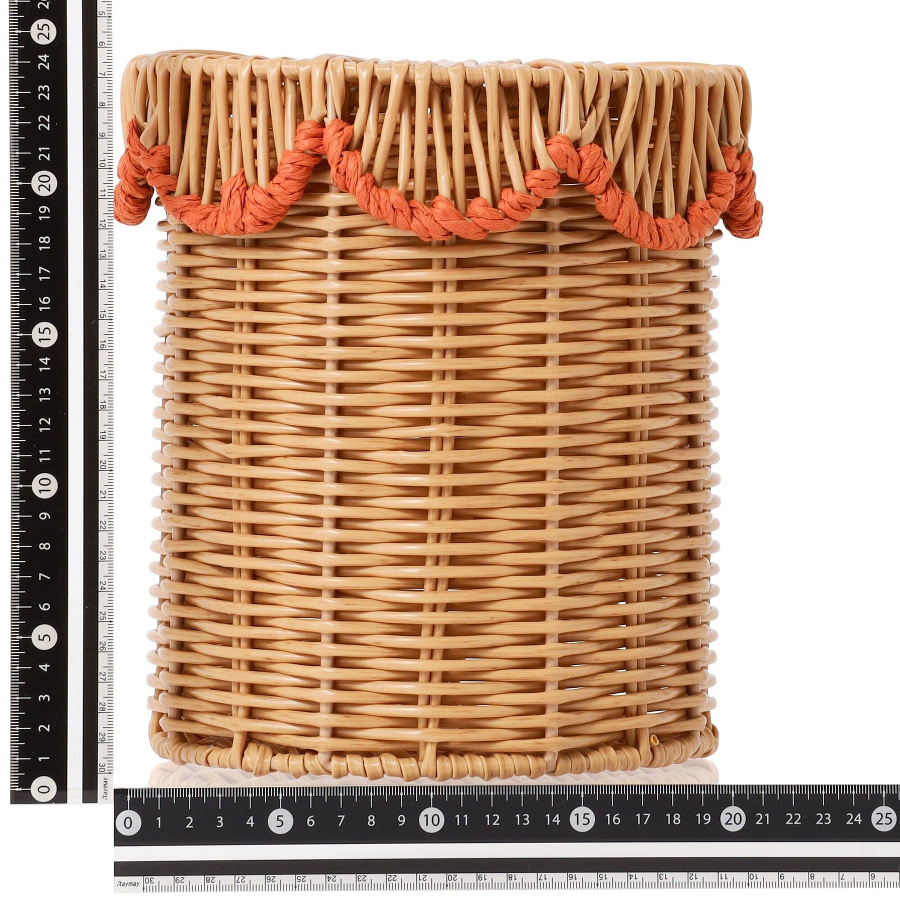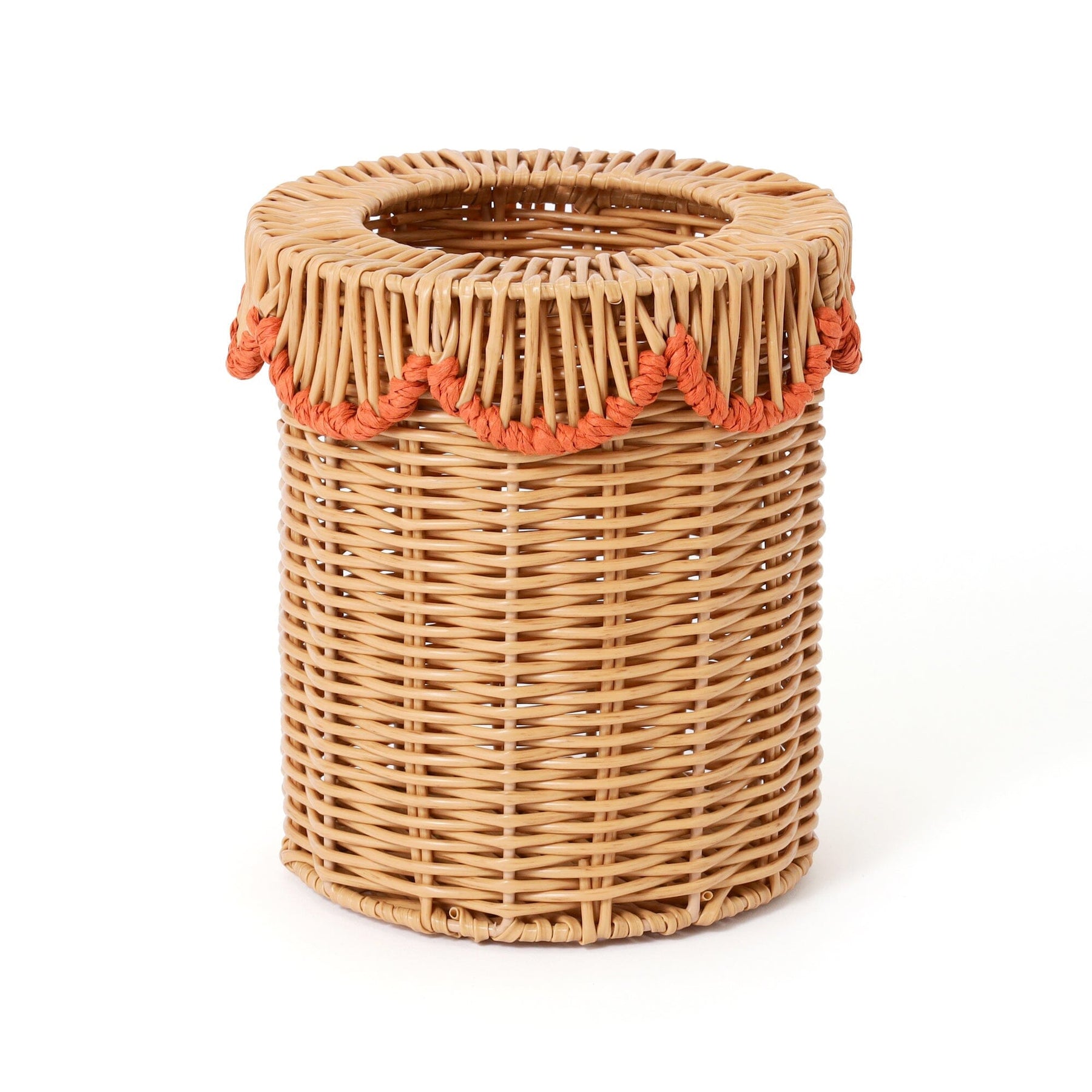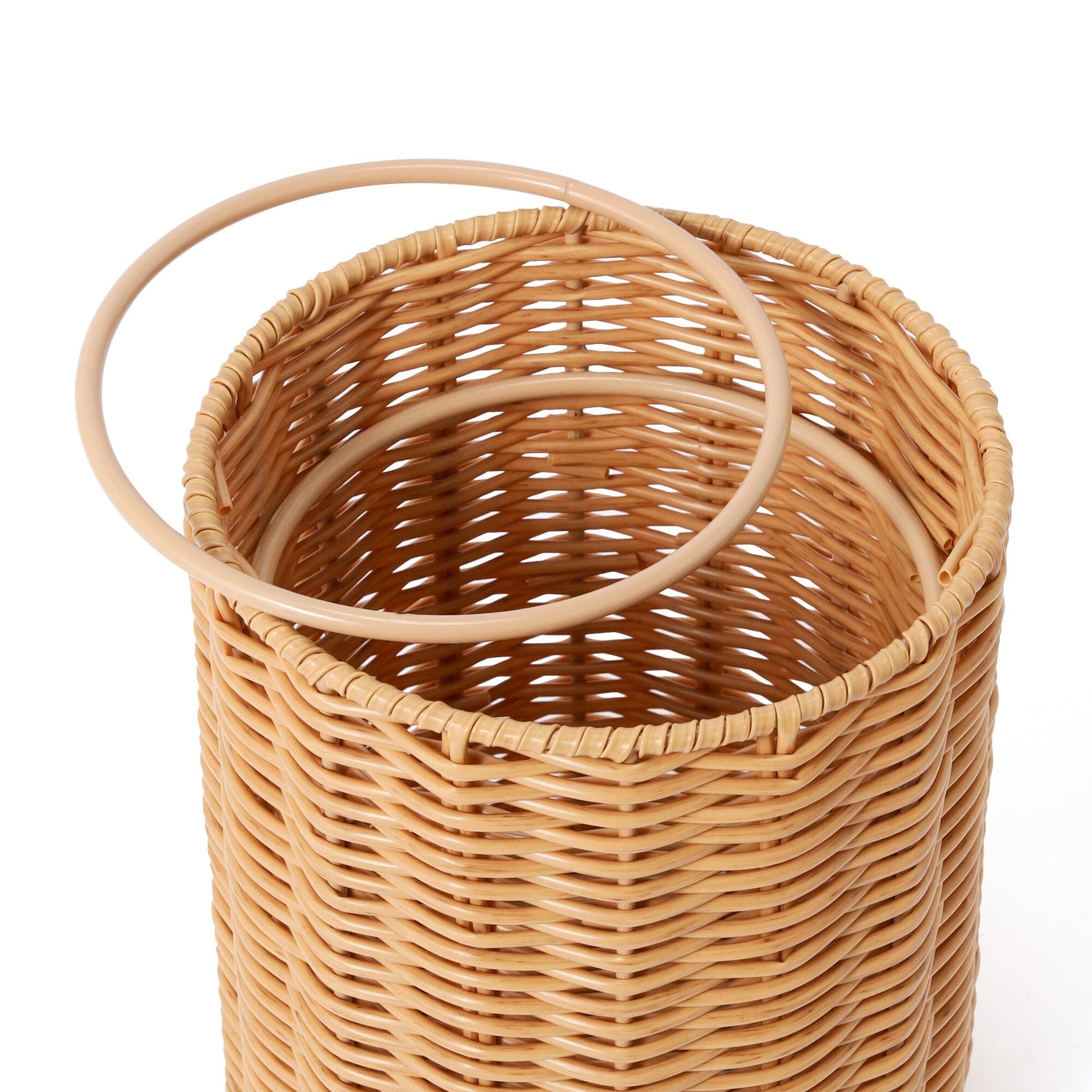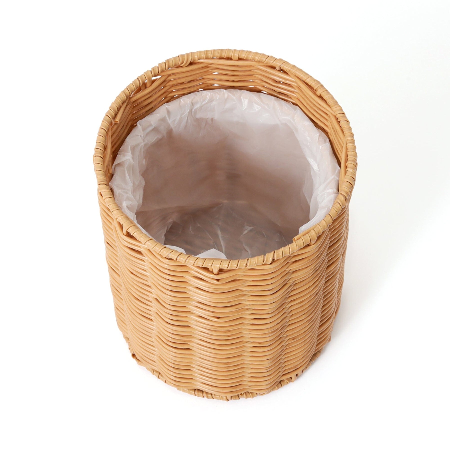 This is a rattan-style trash can made of plastic.