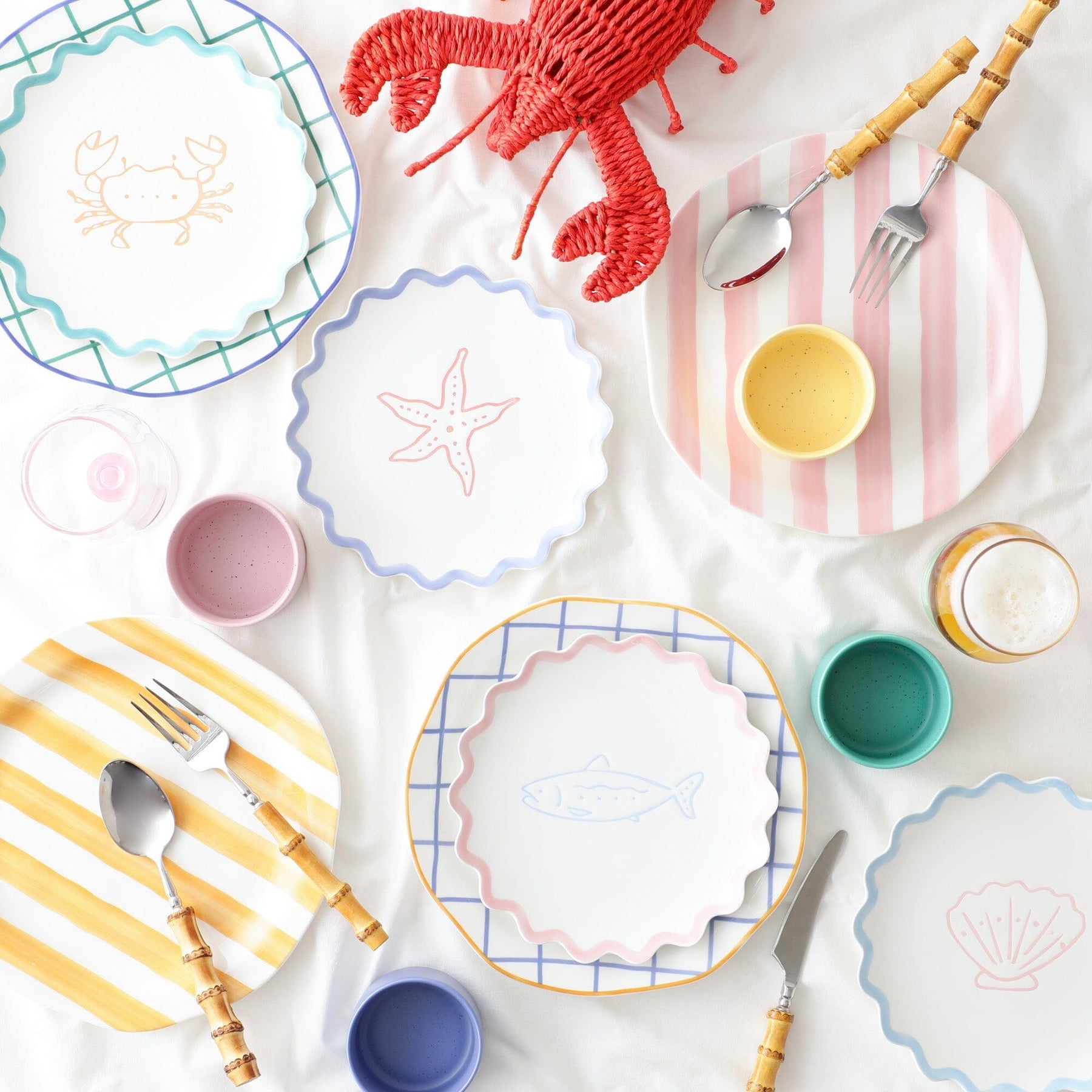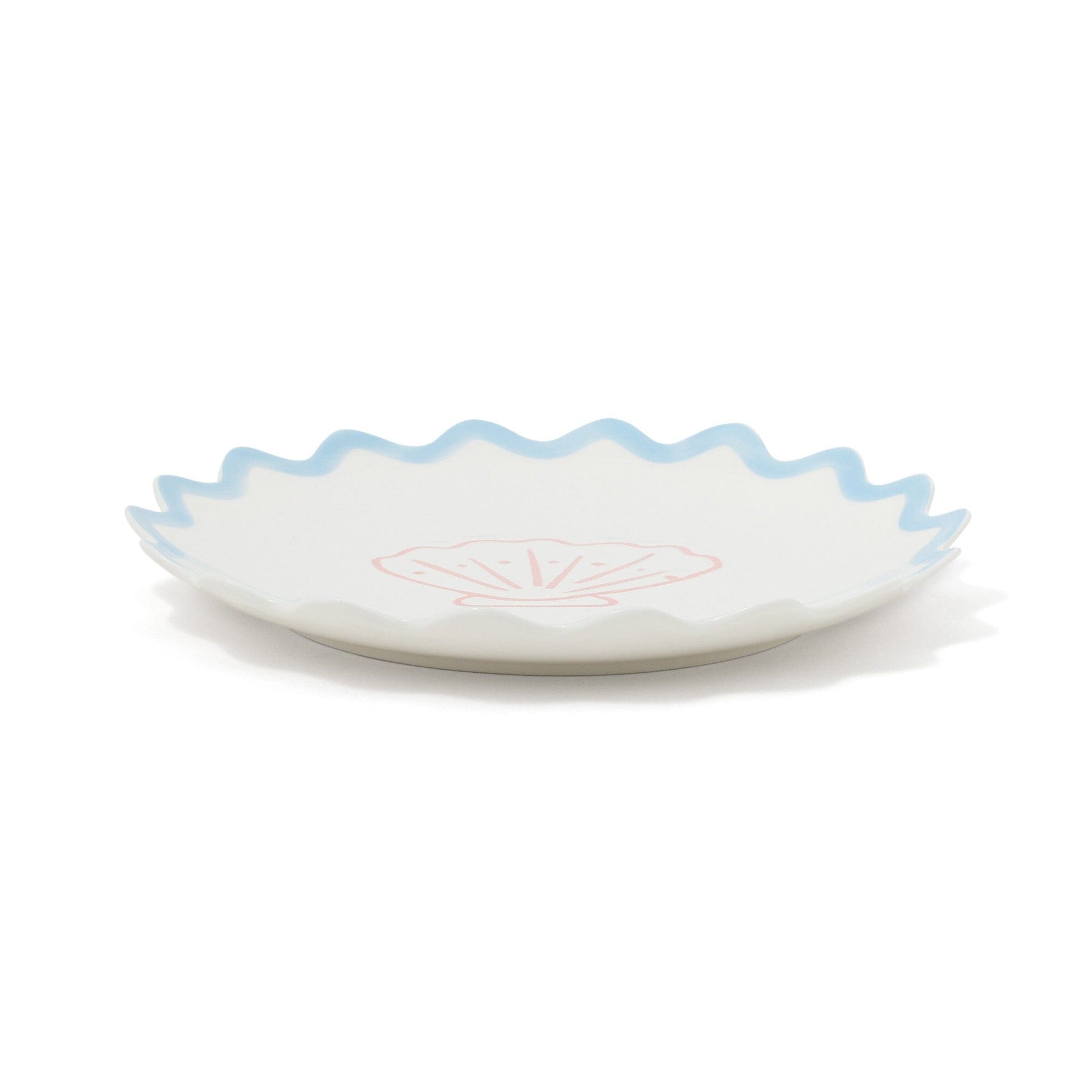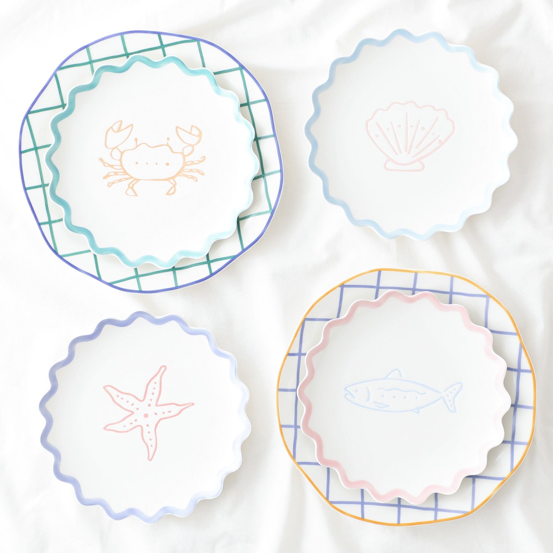 這是一個中等大小的盤子,採用波浪形設計,上面有海洋生物的插圖。