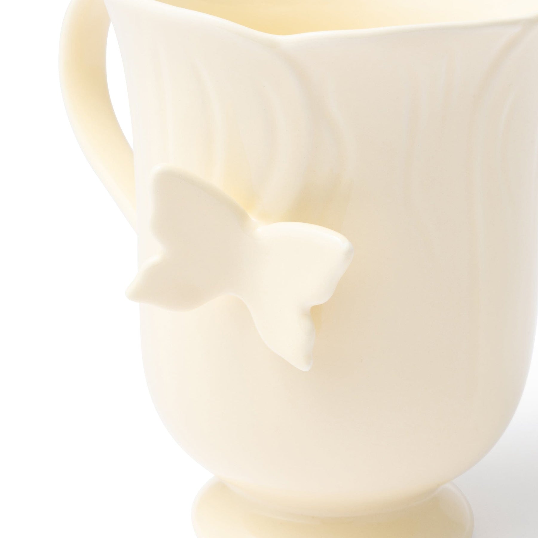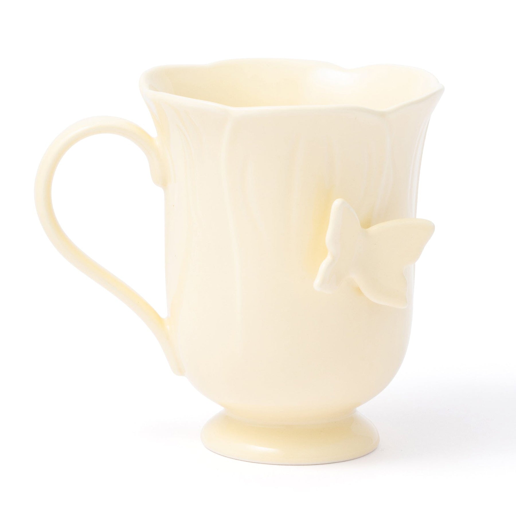 A lovely mug shaped like a flower.A butterfly is the focal point.