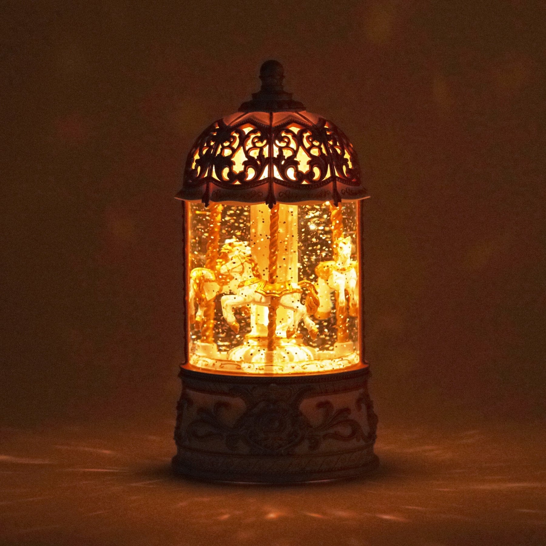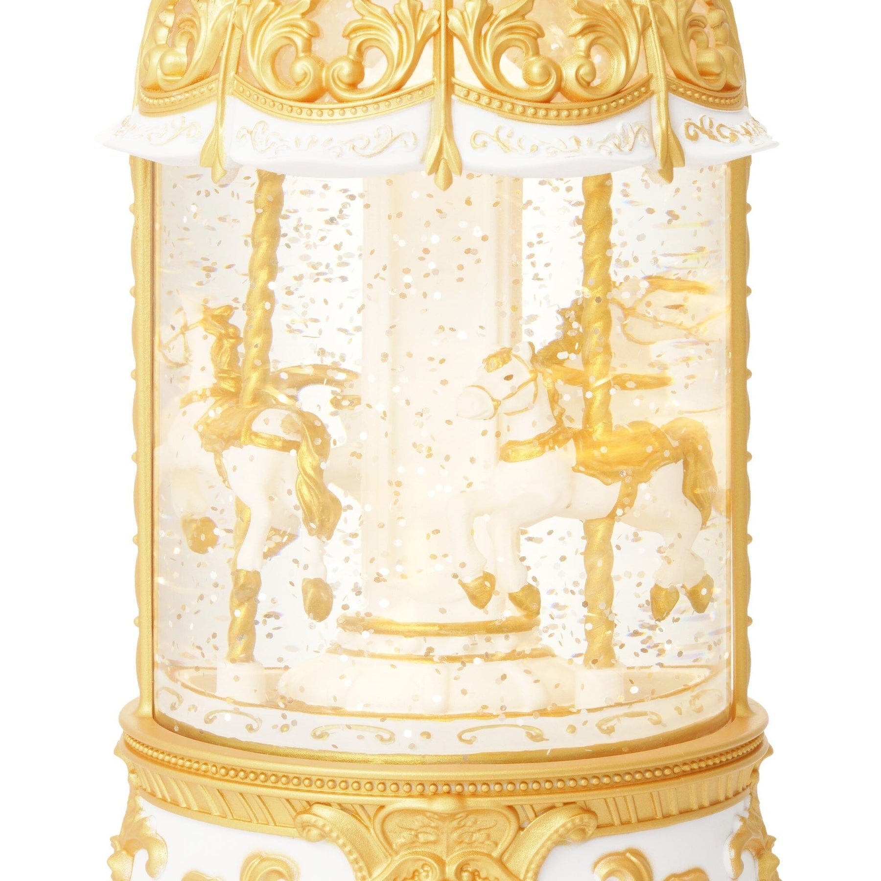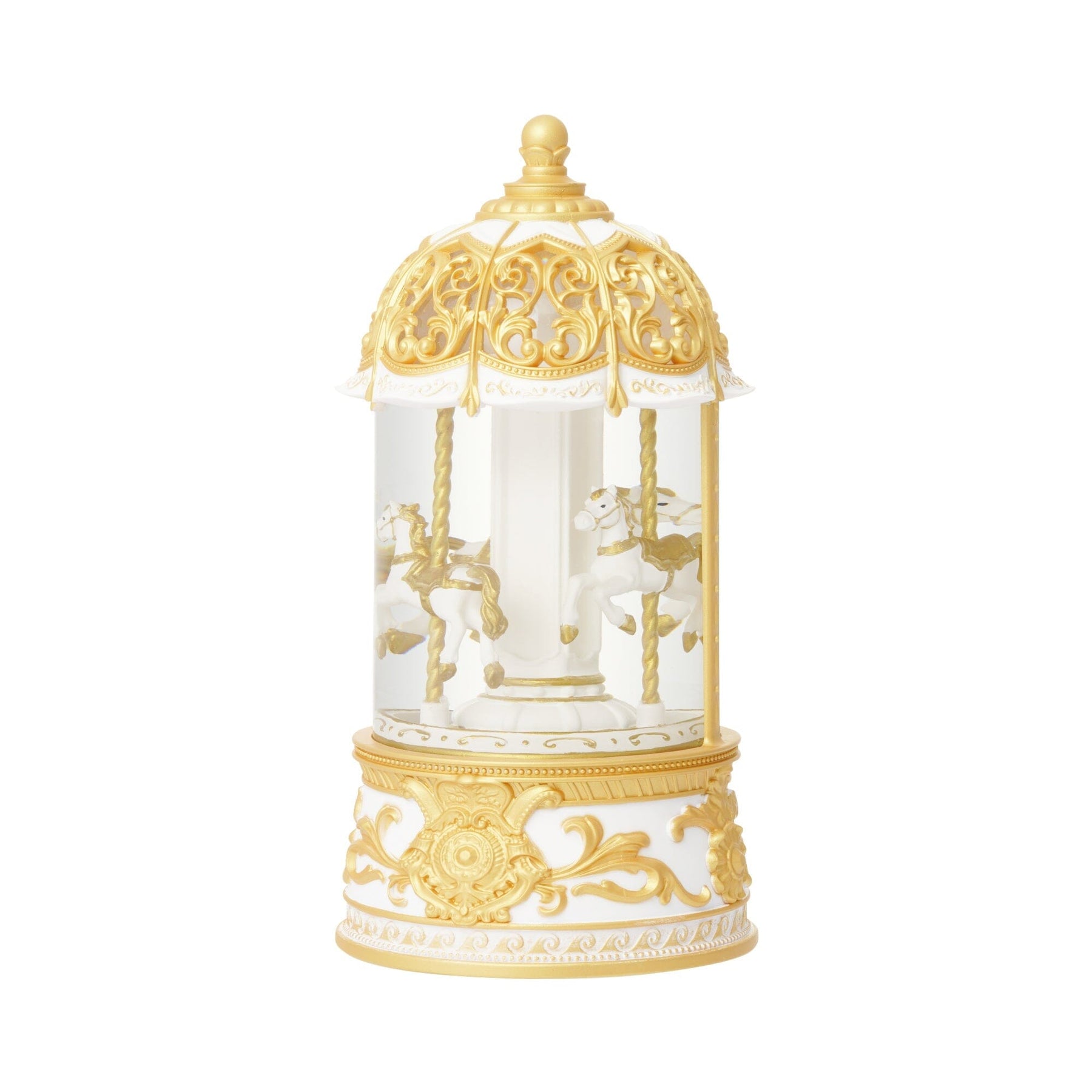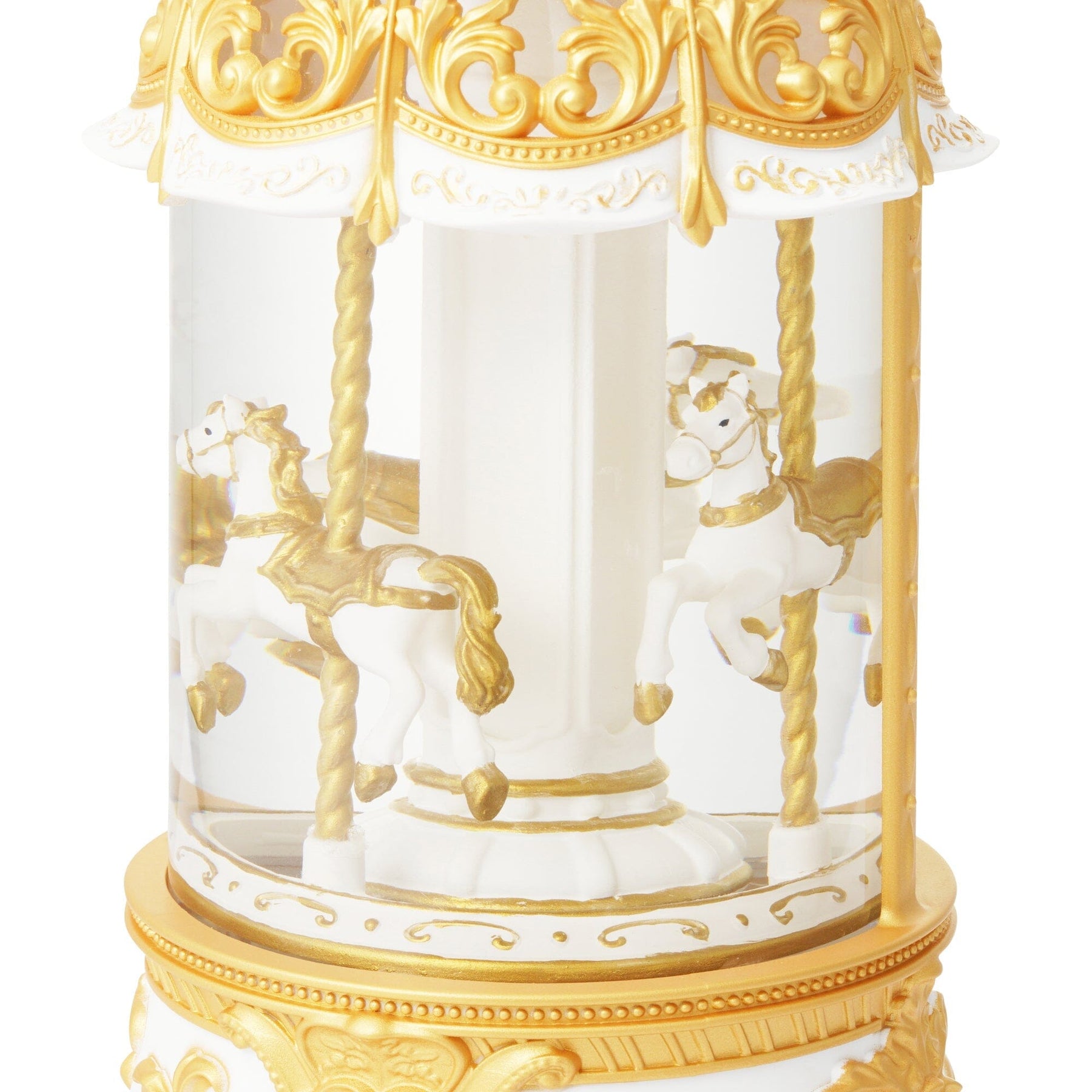 This is an automatically rotating merry-go-round snow globe.